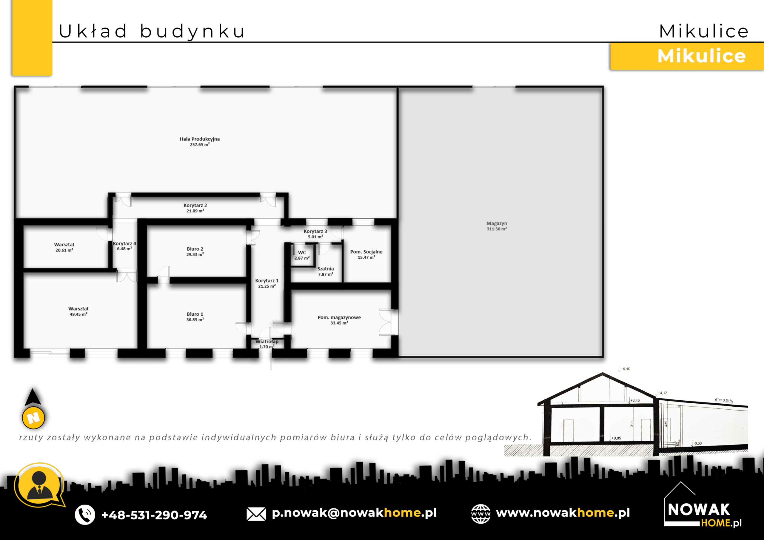 📌 Na załączonym rzucie widoczny jest czytelny podział funkcjonalny (hala + magazyn + biura + zaplecze).