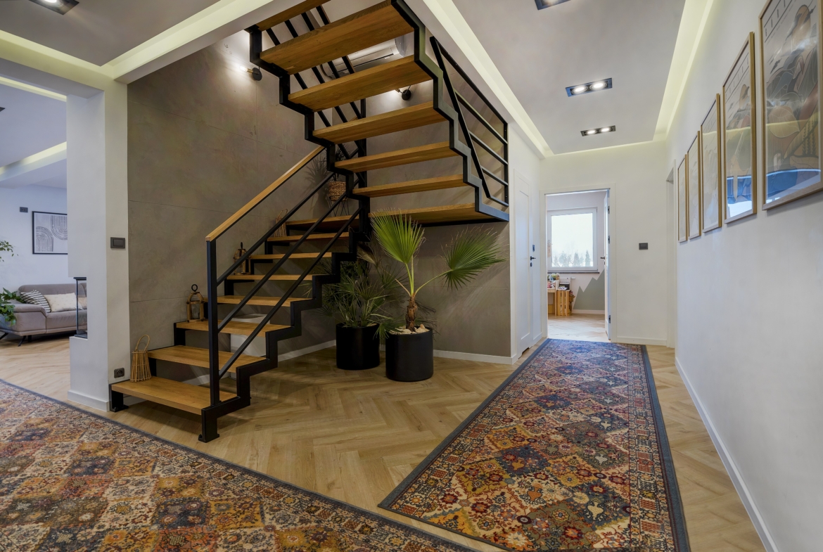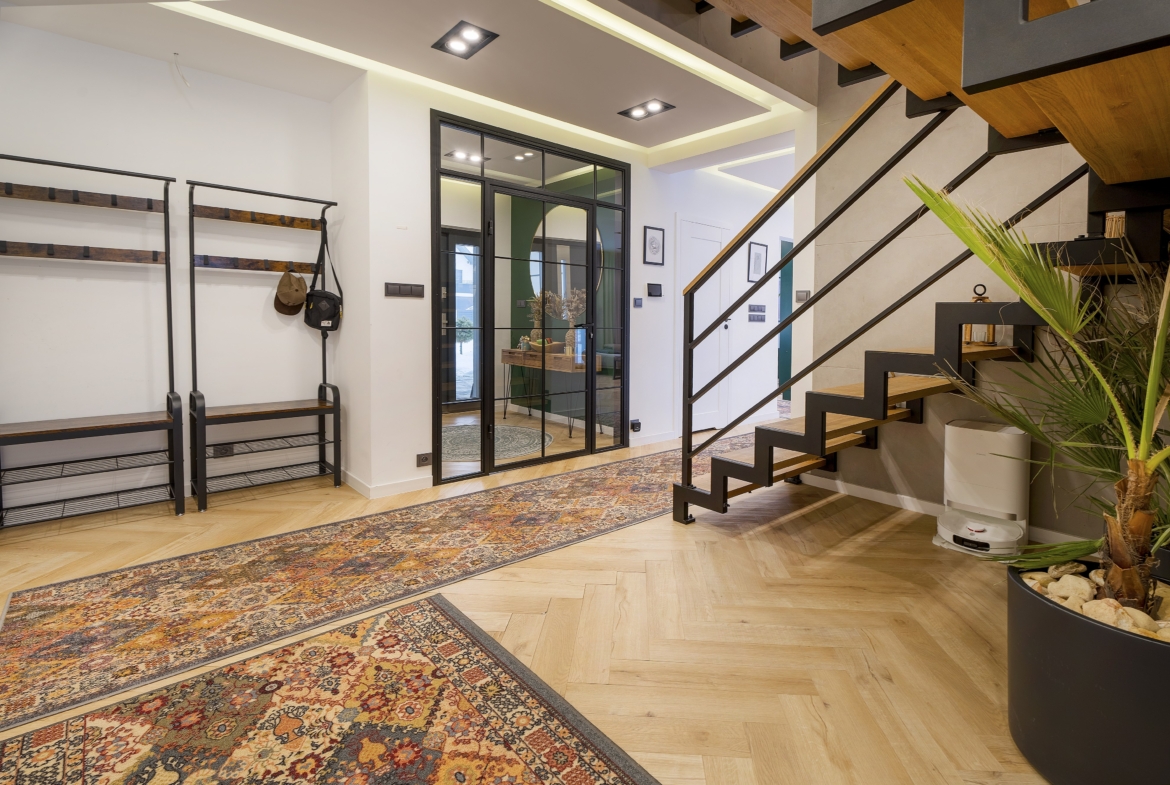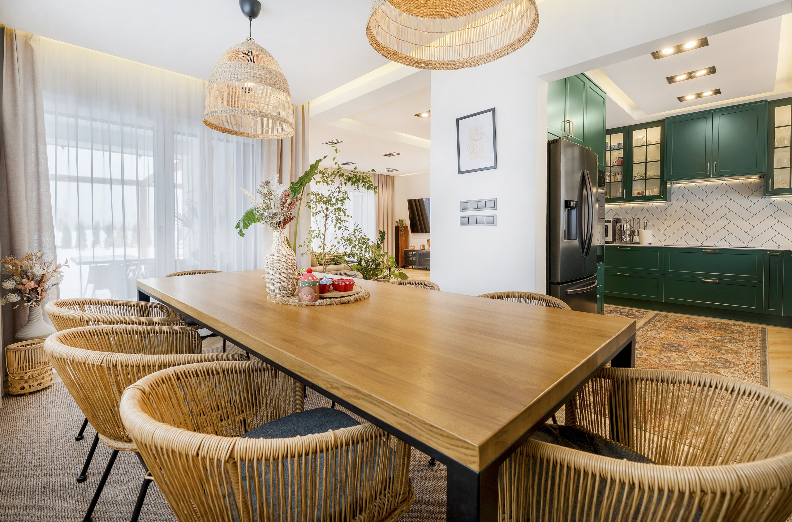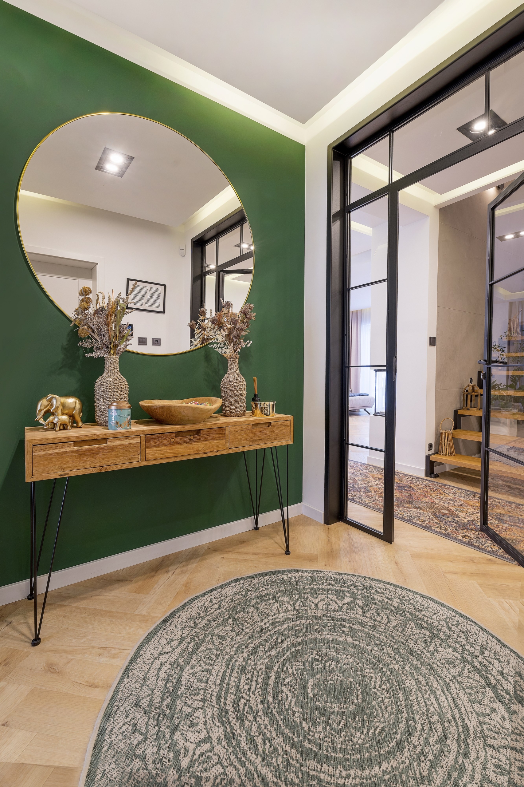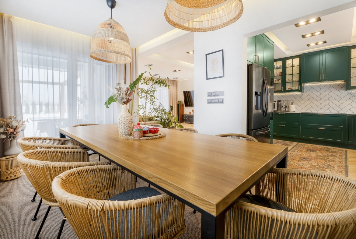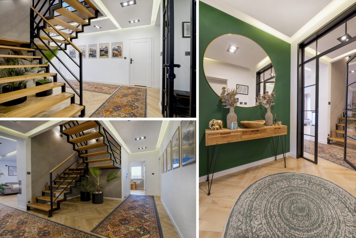 Dom został urządzony w spójnej estetyce nowoczesnej elegancji, z wykorzystaniem wysokiej klasy materiałów i dbałością o detale. We wnętrzach dominują jasne dęby, głęboka zieleń, złamana biel oraz subtelne akcenty czerni i złota.