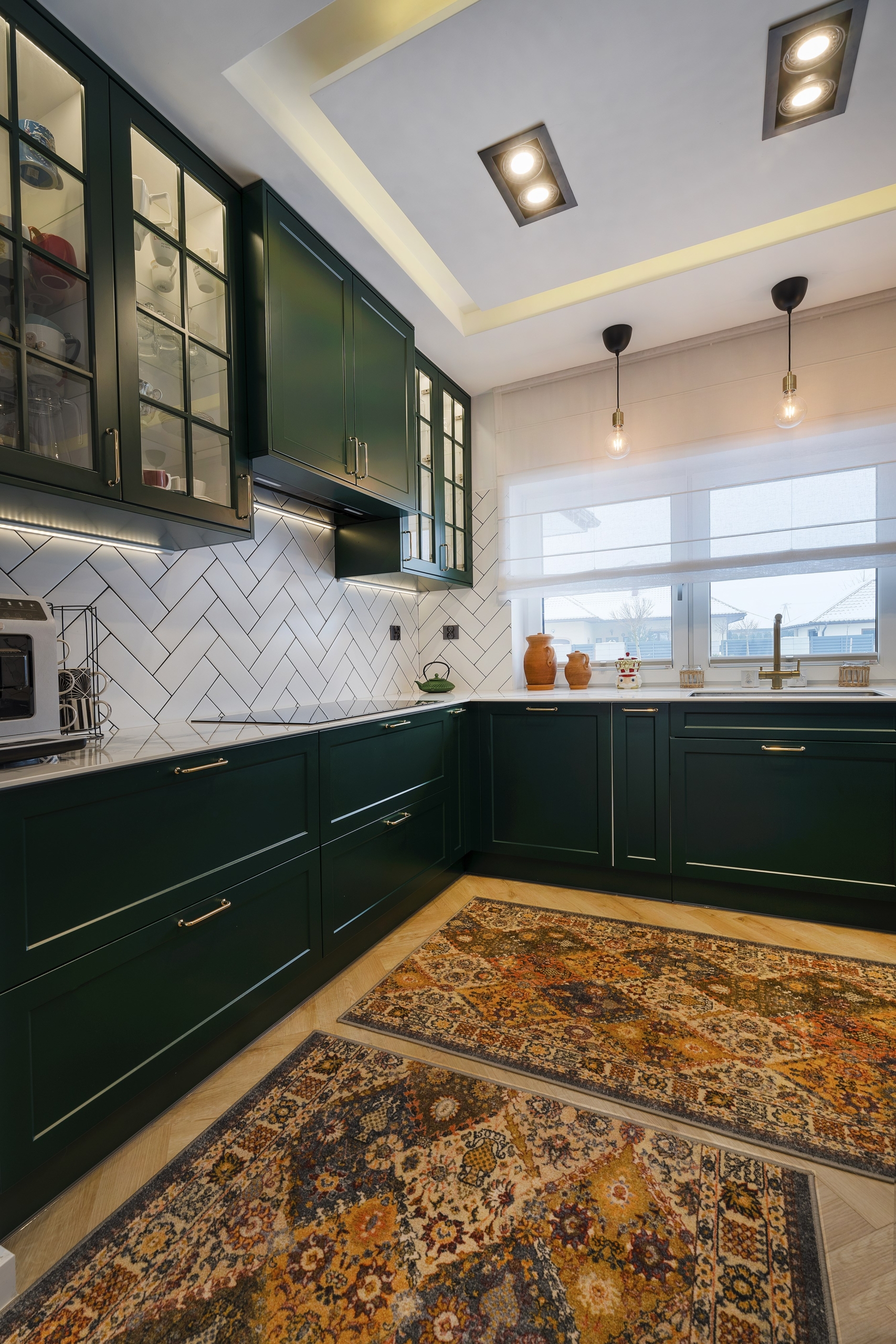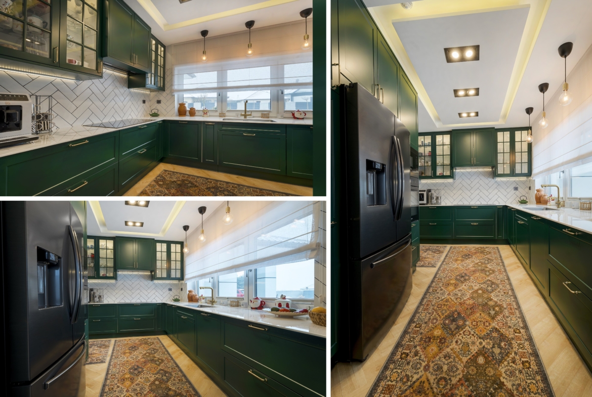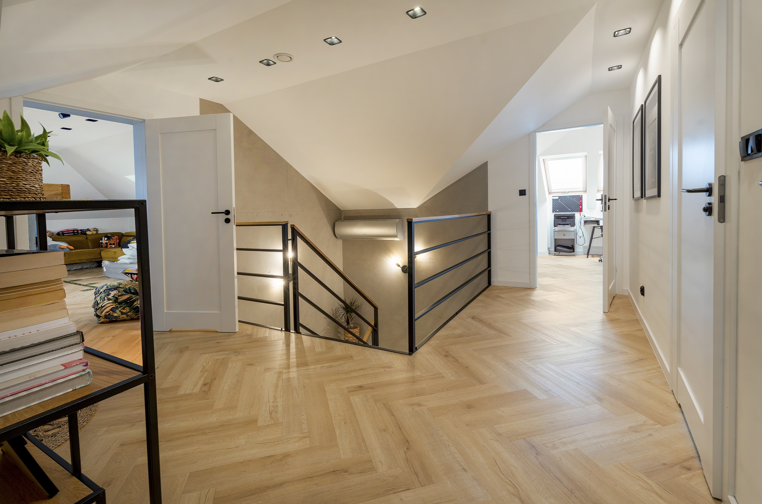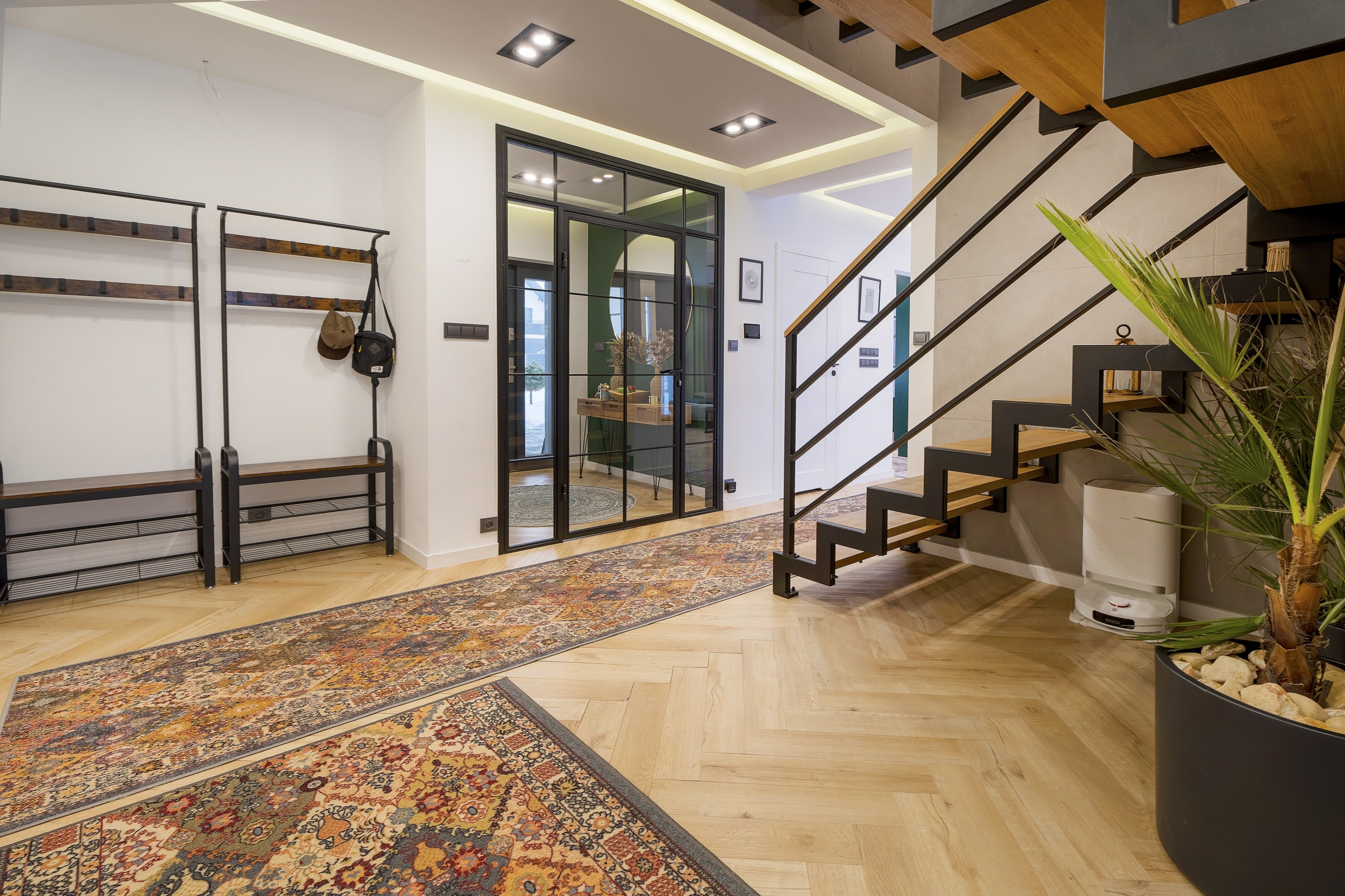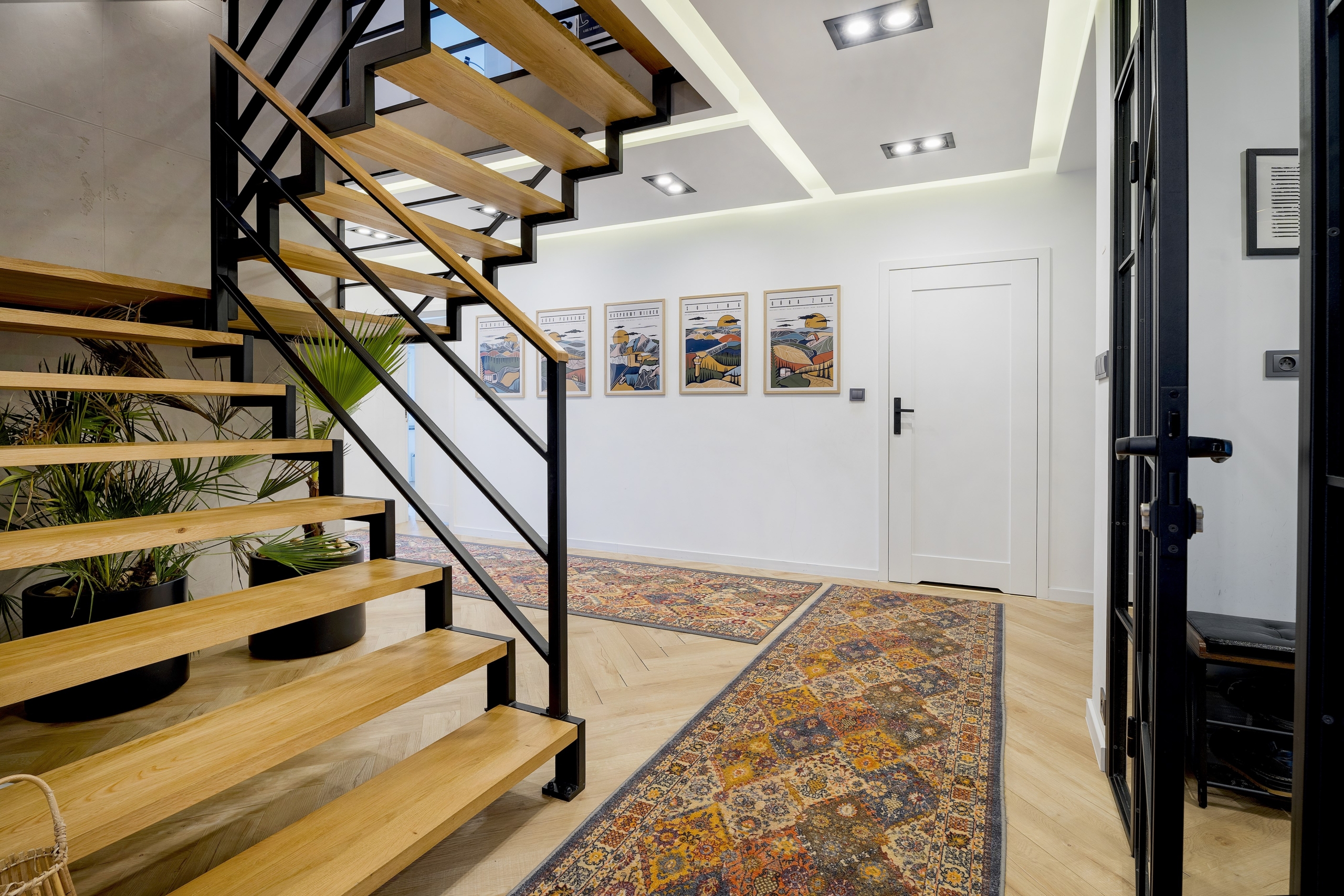 Dom został urządzony w spójnej estetyce nowoczesnej elegancji, z wykorzystaniem wysokiej klasy materiałów i dbałością o detale. We wnętrzach dominują jasne dęby, głęboka zieleń, złamana biel oraz subtelne akcenty czerni i złota.