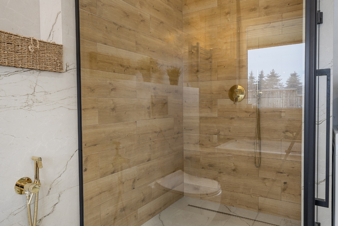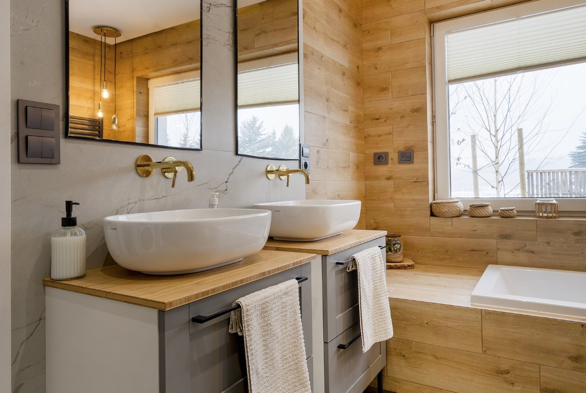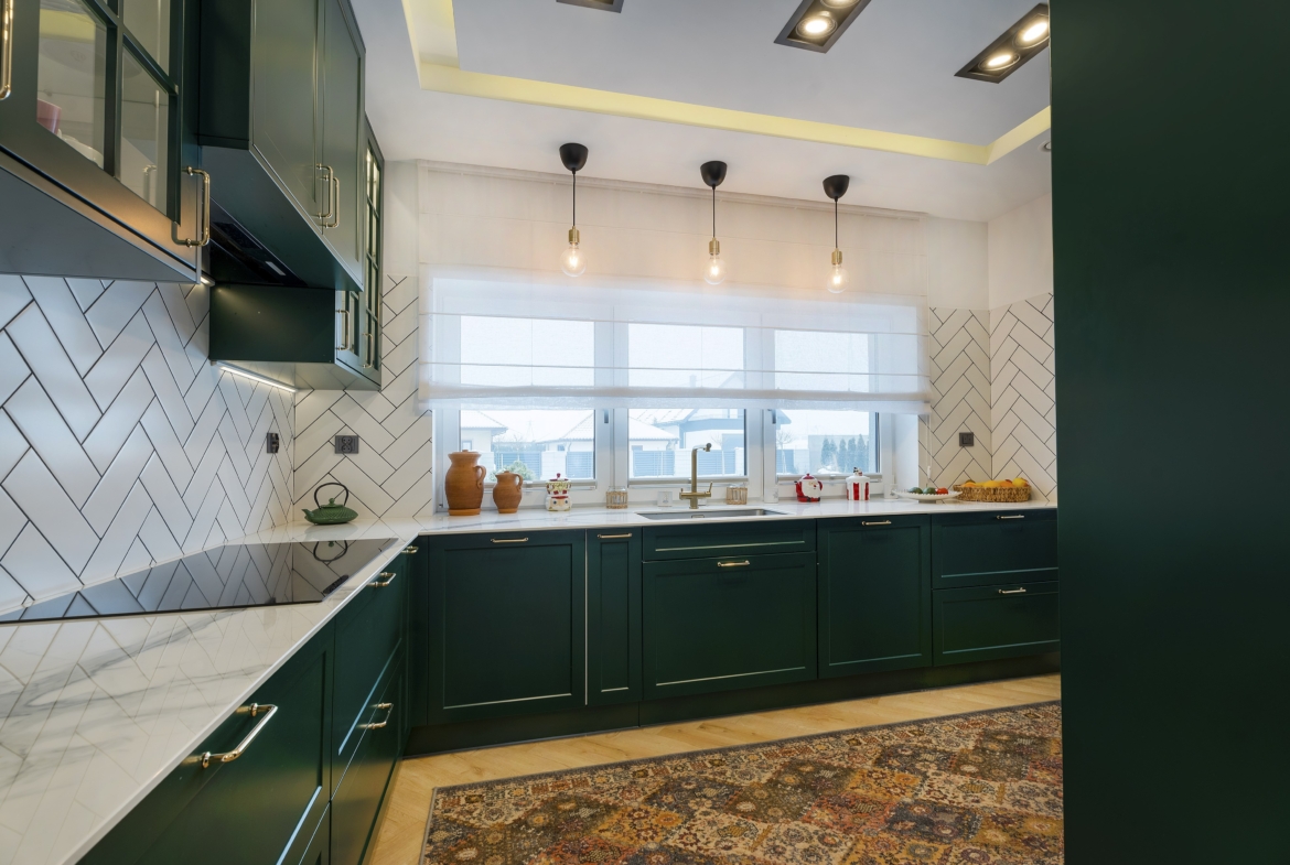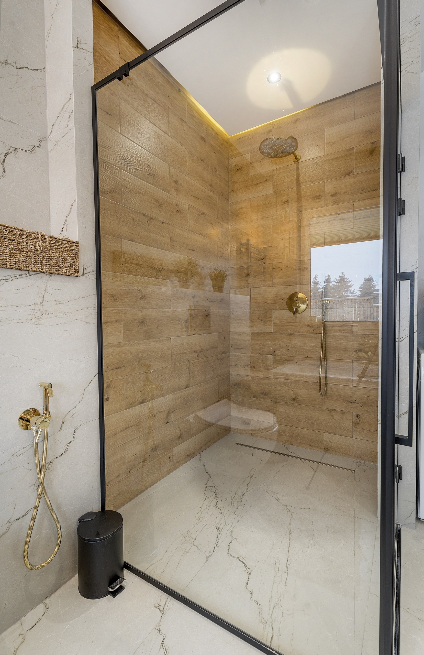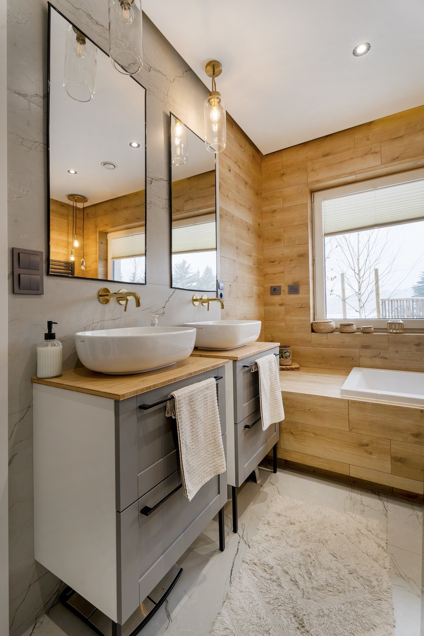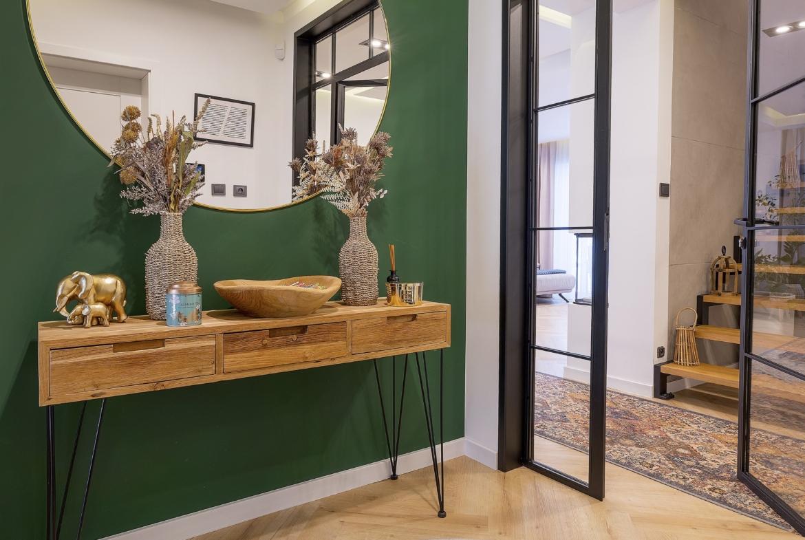 Dom został urządzony w spójnej estetyce nowoczesnej elegancji, z wykorzystaniem wysokiej klasy materiałów i dbałością o detale. We wnętrzach dominują jasne dęby, głęboka zieleń, złamana biel oraz subtelne akcenty czerni i złota.