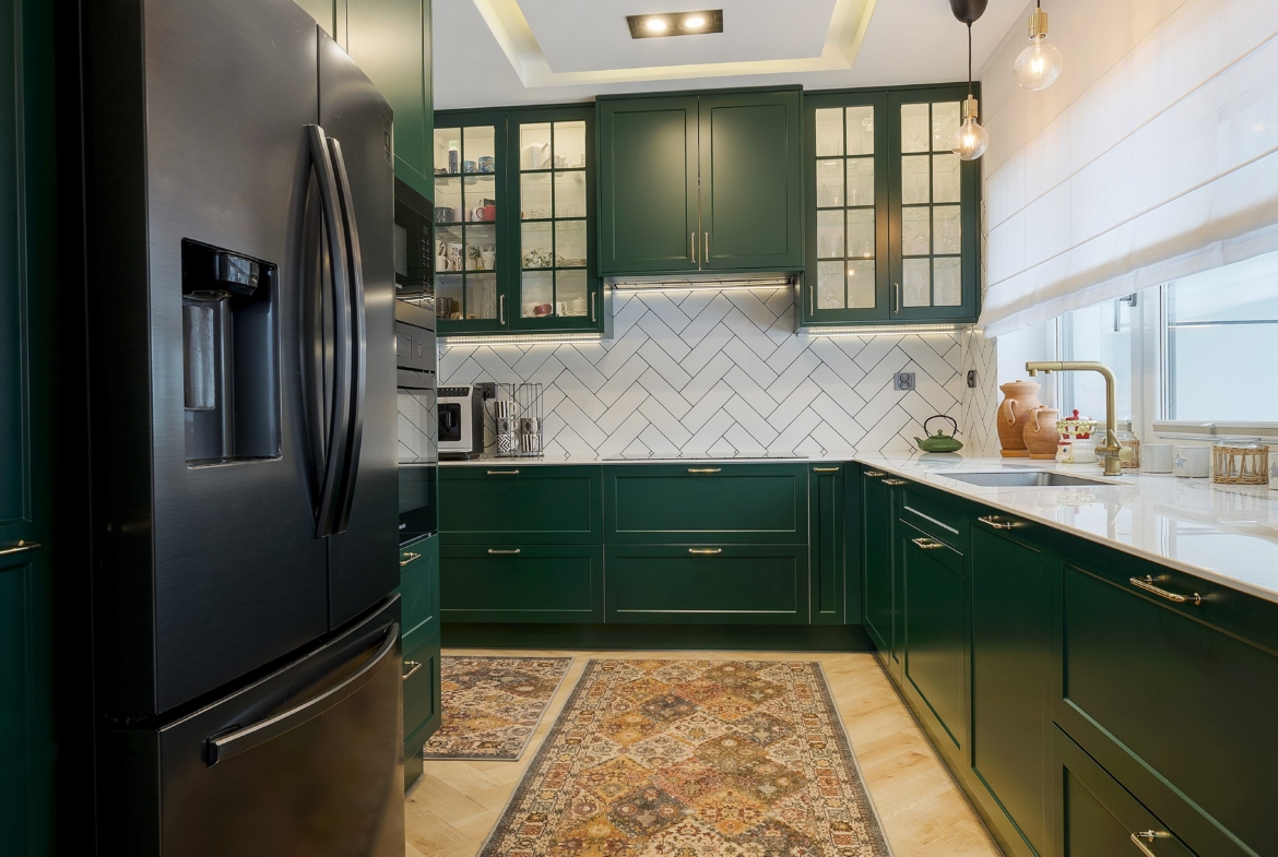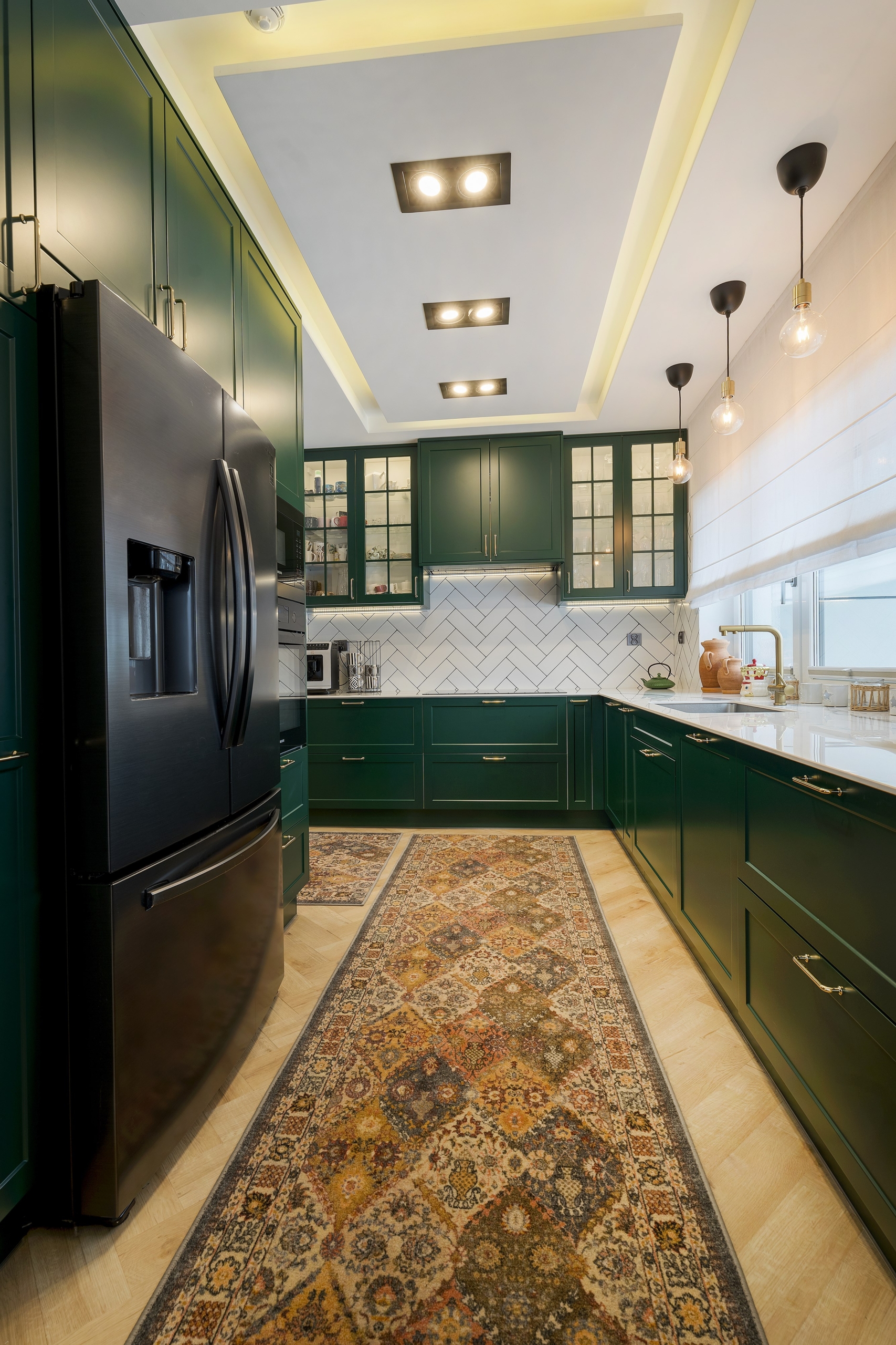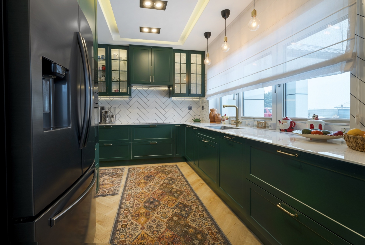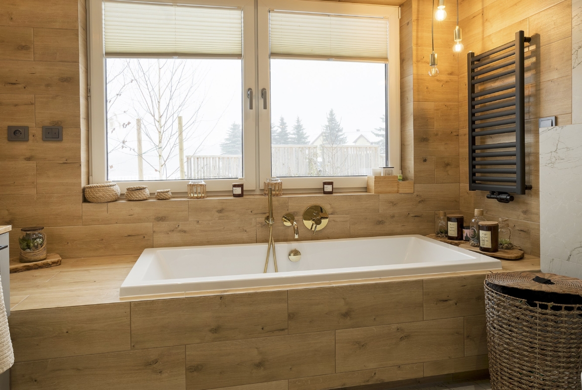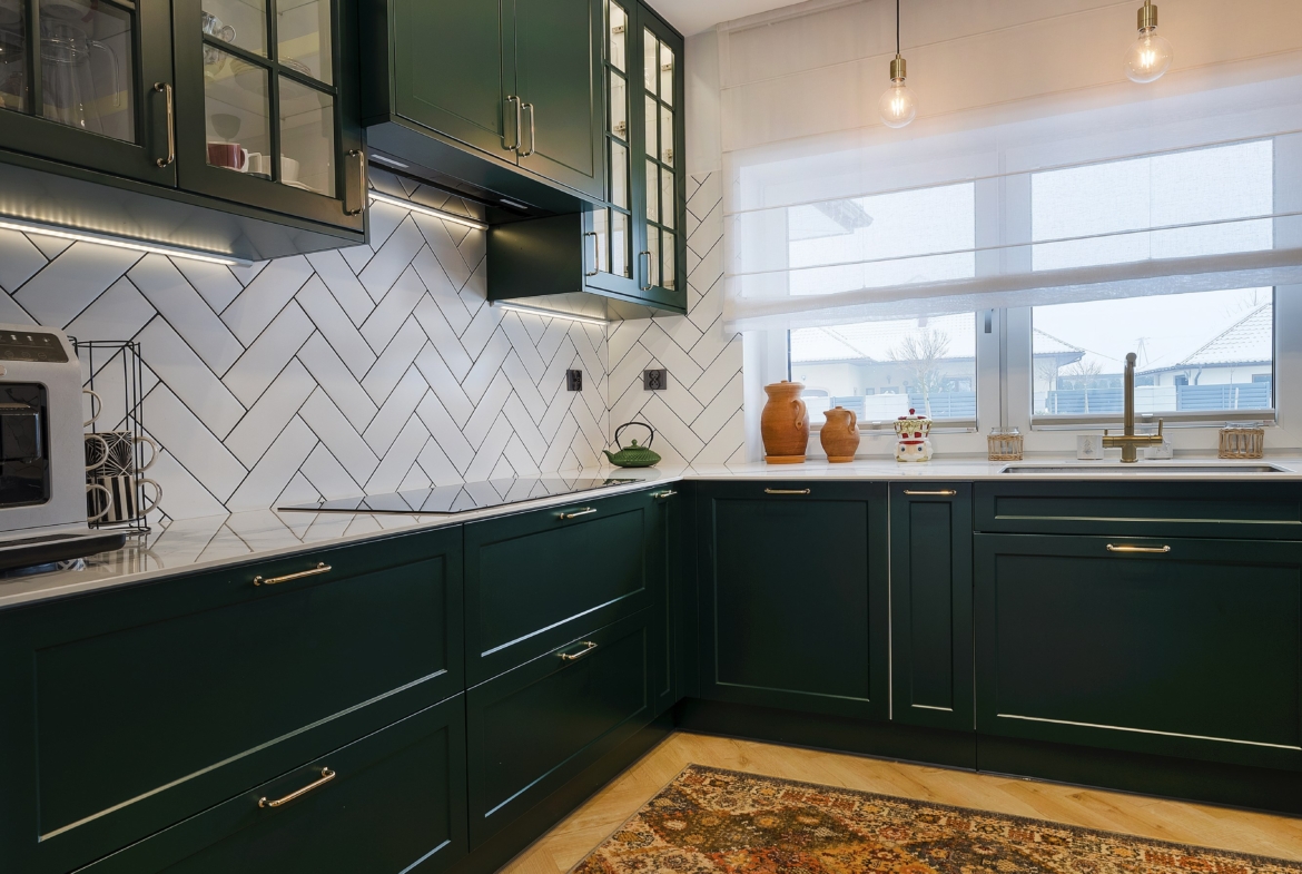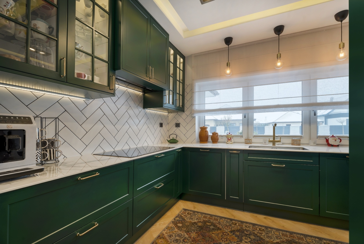 Dom został urządzony w spójnej estetyce nowoczesnej elegancji, z wykorzystaniem wysokiej klasy materiałów i dbałością o detale. We wnętrzach dominują jasne dęby, głęboka zieleń, złamana biel oraz subtelne akcenty czerni i złota.