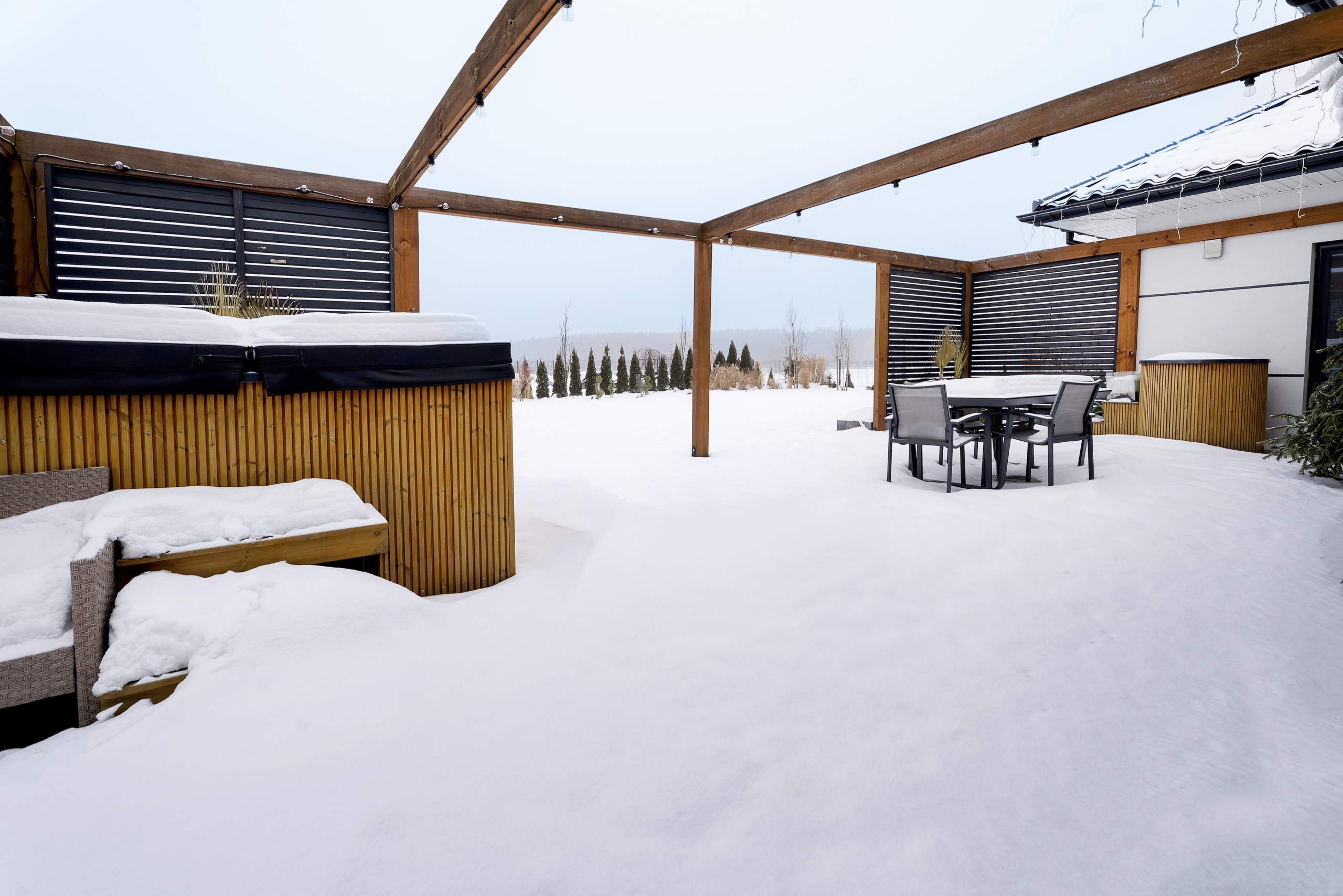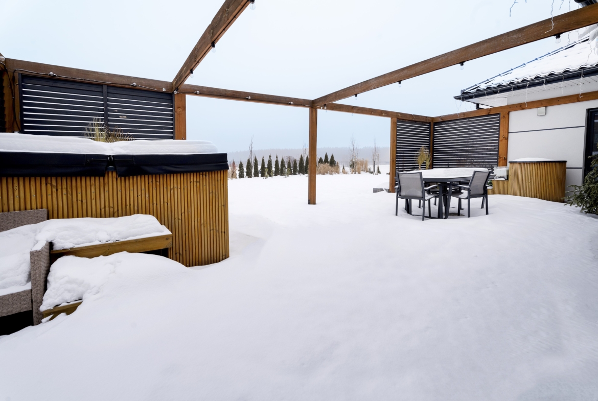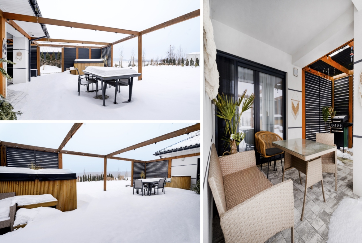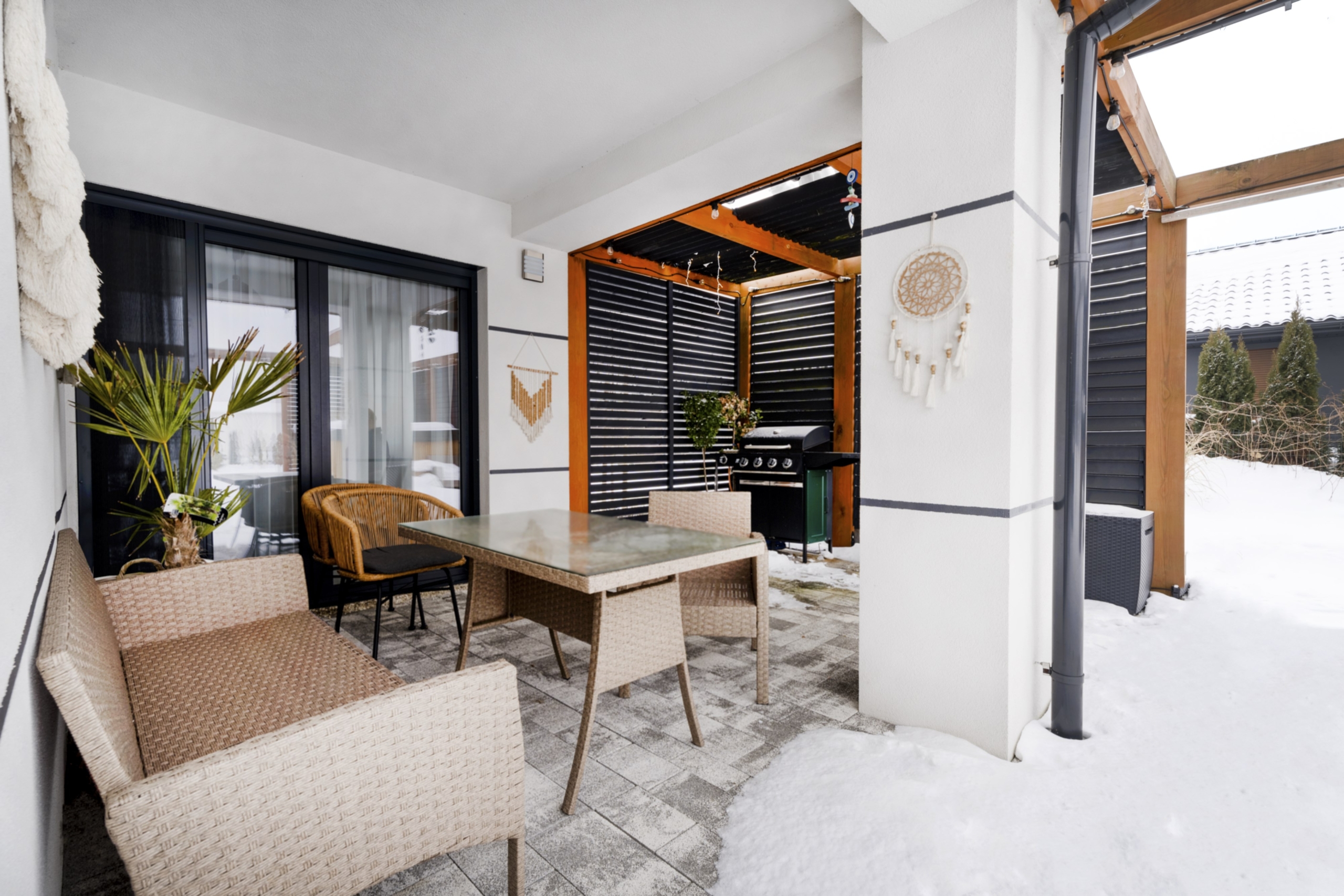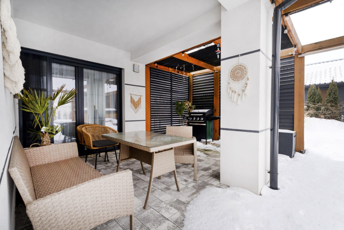 Z salonu i jadalni wyjście na wybrukowany taras, który pełni funkcję prywatnej strefy wypoczynkowej.