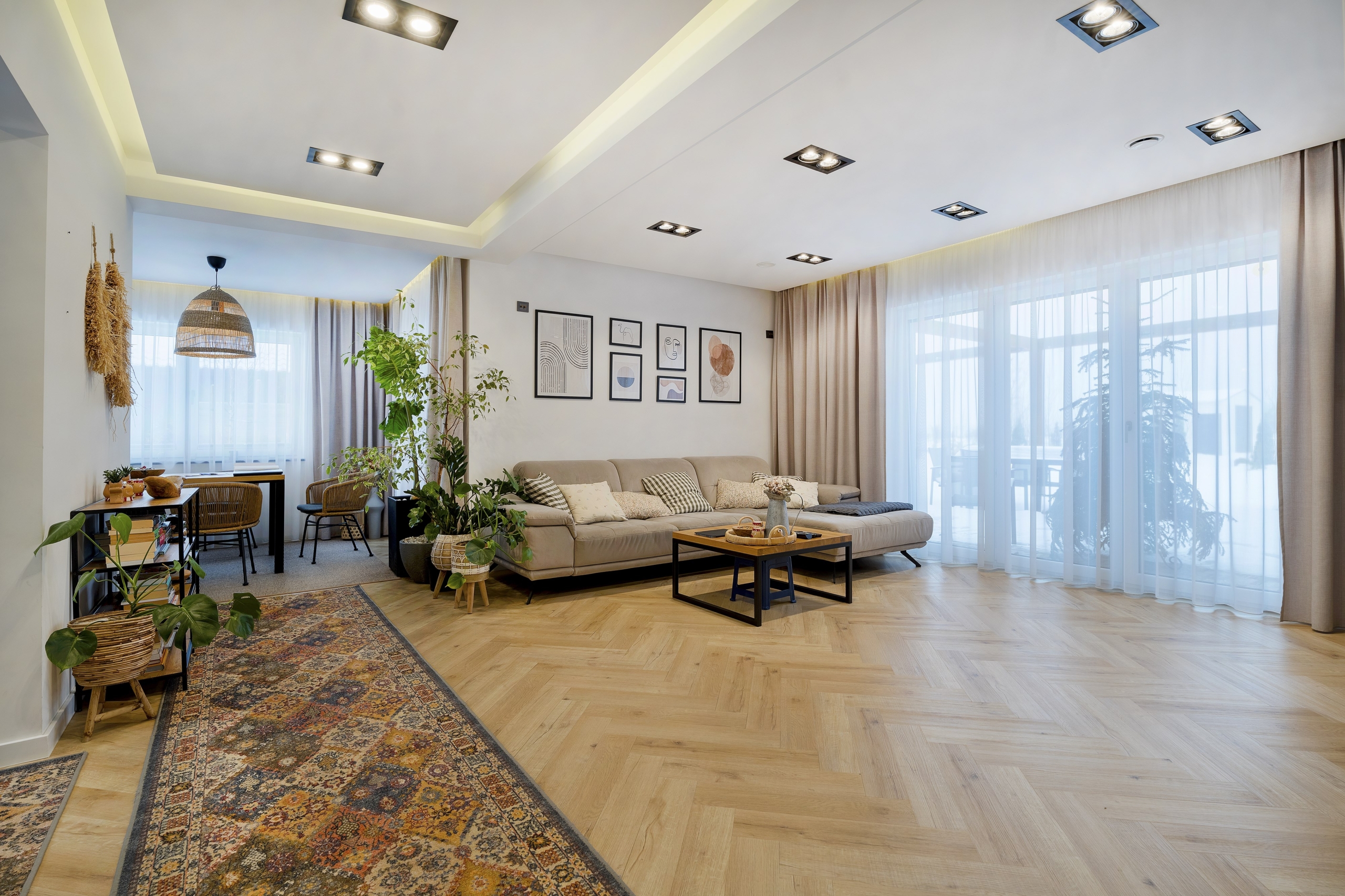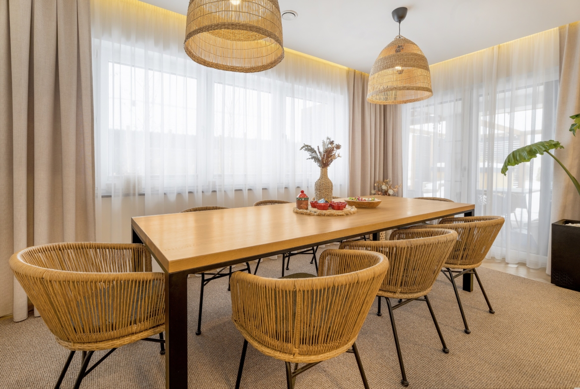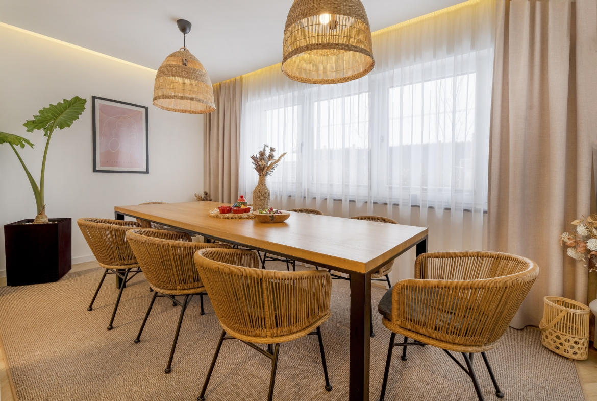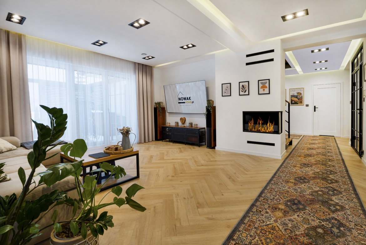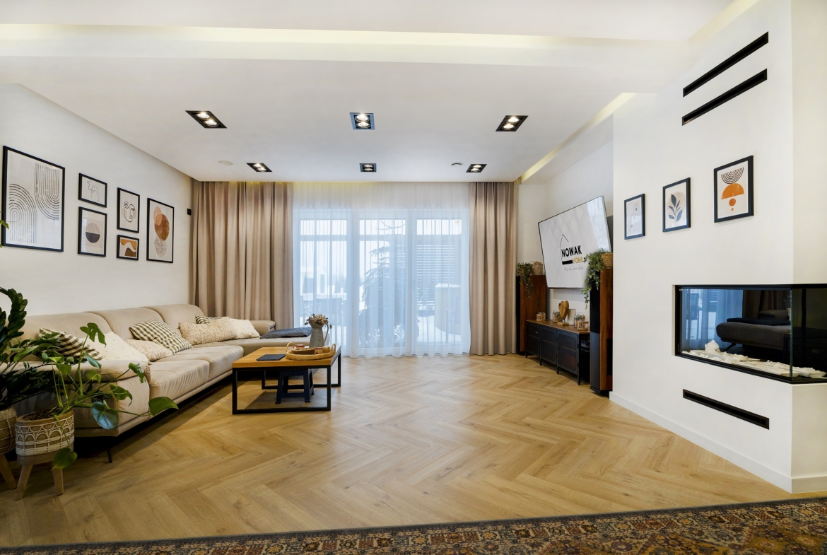Całość tworzy luksusową, ale przytulną przestrzeń, idealną zarówno do codziennego życia, jak i spotkań towarzyskich.