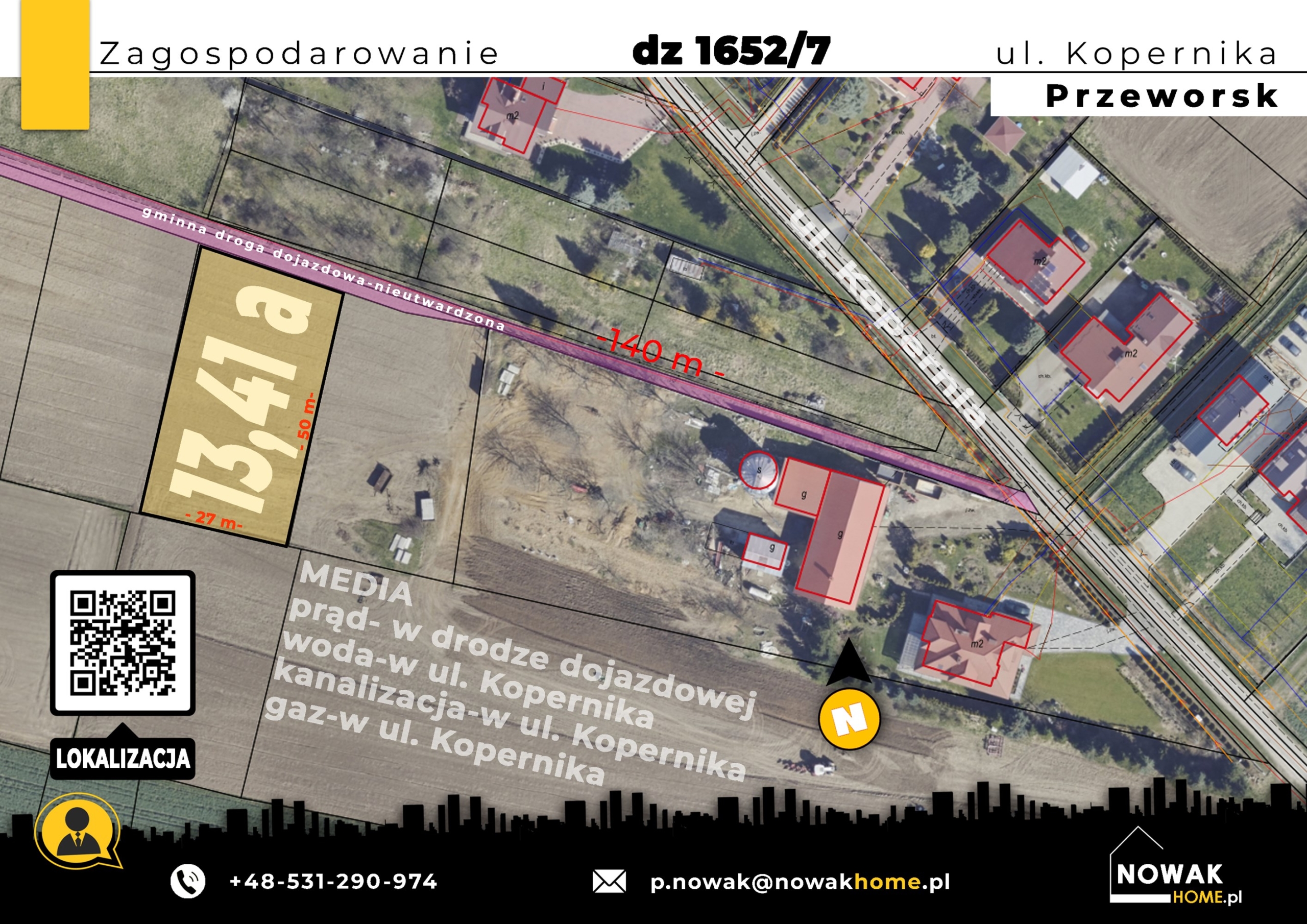 ul. Kopernika Przeworsk. Sprzedam działkę budowlaną przy ul Kopernika o pow. 13,41 a (1341 m2) nieruchomość jest płaska, niezadrzewiona, uporządkowana o kształcie prostokąta o wymiarach 27 m x 51 x, Dojazd do nieruchomości nieutwardzoną drogą gminną. Wszystkie media w sąsiedztwie 140 m.