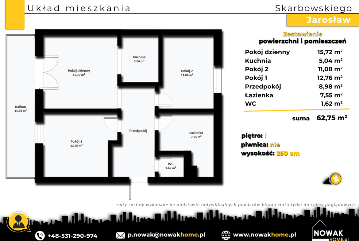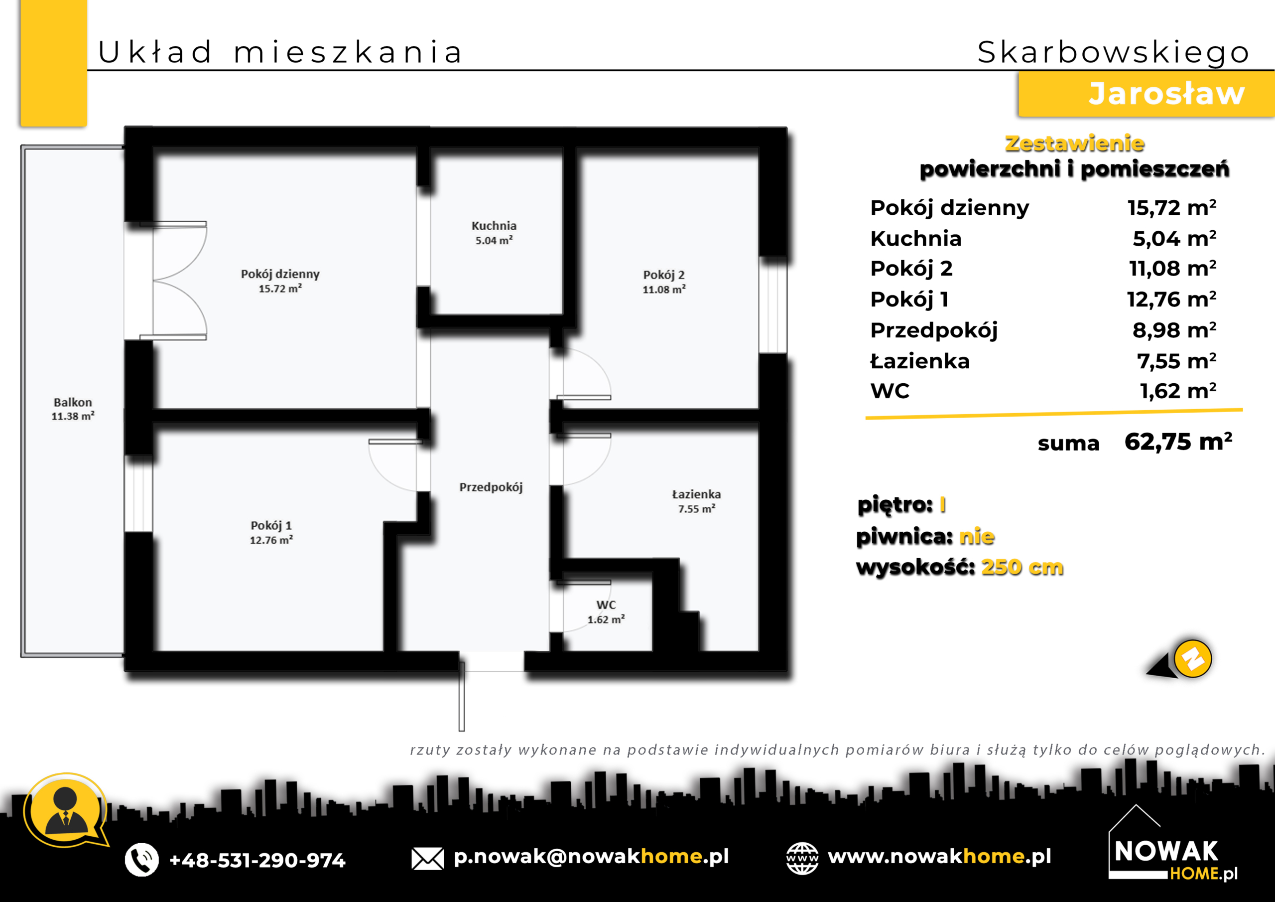Skarbowskiego Jarosław. Na sprzedaż funkcjonalne mieszkanie o powierzchni 62,75 m², położone w Jarosławiu w budynku z 2015 roku. Lokal znajduje się na 1 piętrze w kameralnym bloku i oferuje komfortowy układ pomieszczeń idealny dla rodziny lub jako mieszkanie inwestycyjne.
